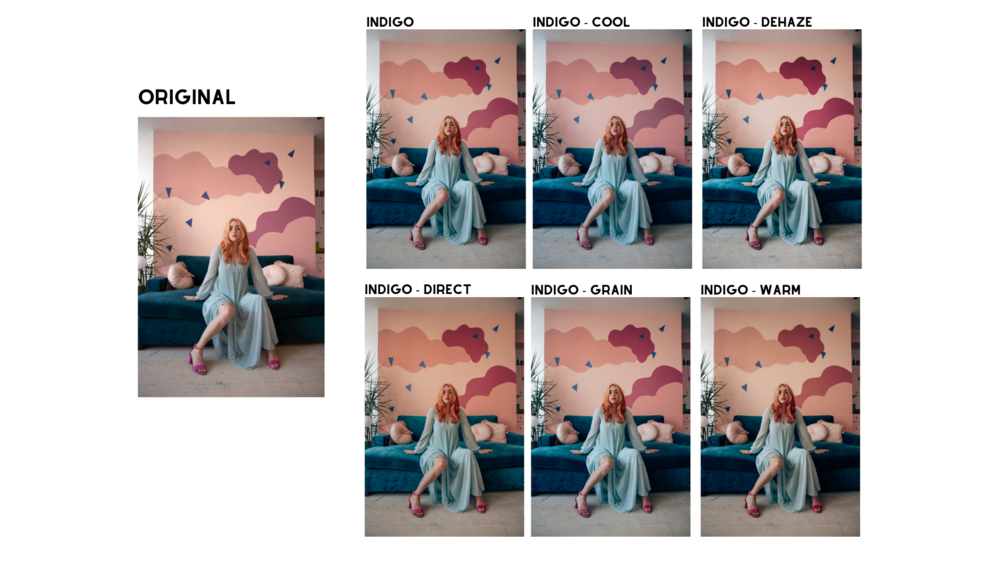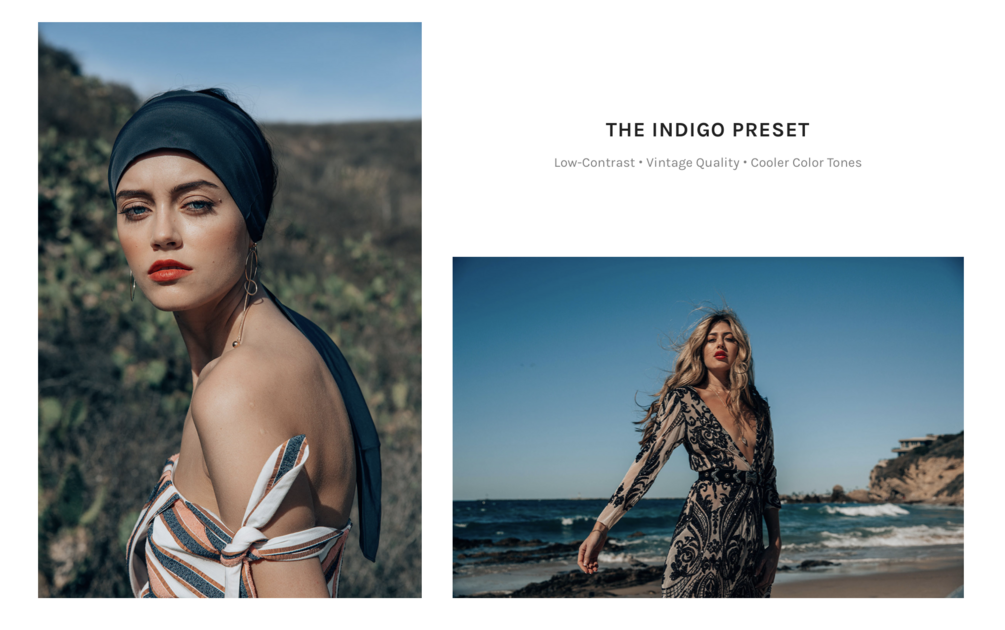 Achieve vintage vibes with the cool-toned Indigo Preset. Mattify images with this low-contrast look that is reminiscent of the Polaroid days.